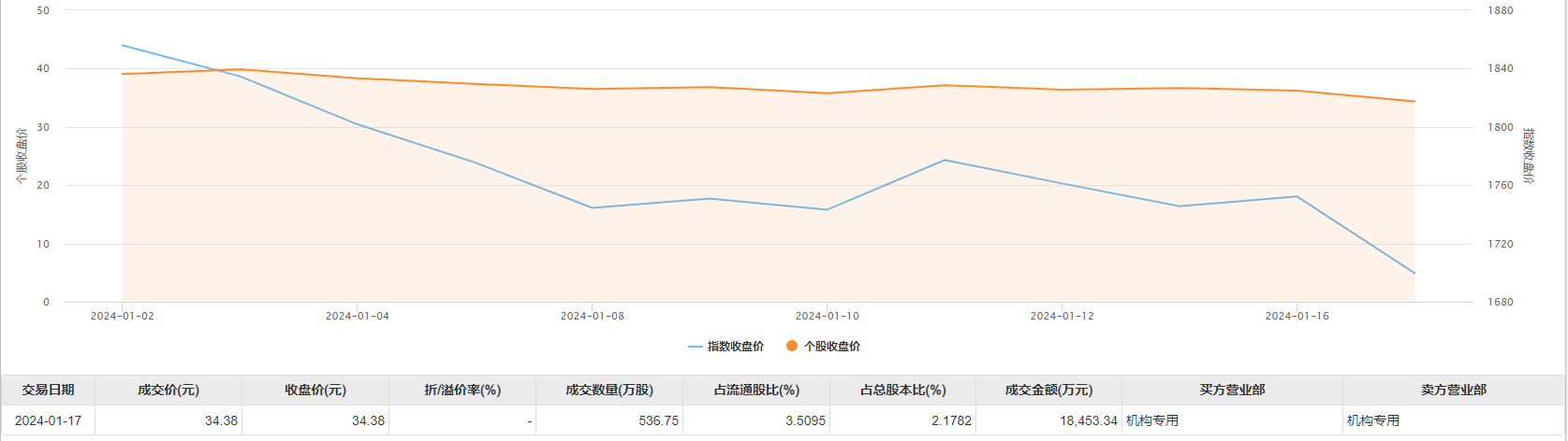 今日出现1.85亿元大宗交易,成交价34.38元/股,与今日收盘价相同。买、卖方均为机构专用席位。
