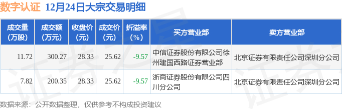 证券之星消息,12月24日数字认证发生大宗交易,交易数据如下: