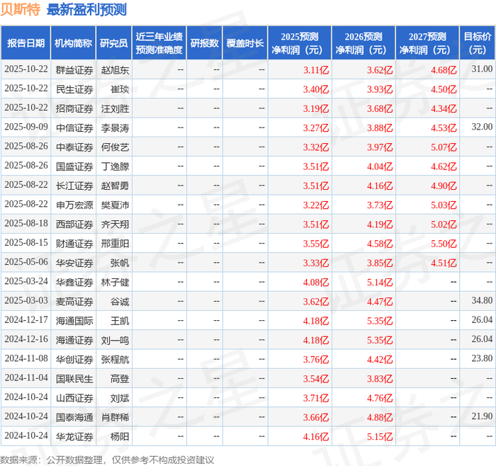 贝斯特2025年三季报显示,前三季度公司主营收入11.21亿元,同比上升7.52%;归母净利润2.36亿元,同比上升5.06%;扣非净利润2.21亿元,同比上升6.06%;其中2025年第三季度,公司单季度主营收入4.04亿元,同比上升17.2%;单季度归母净利润8773.33万元,同比上升8.2%;单季度扣非净利润8207.06万元,同比上升10.46%;负债率14.72%,投资收益1549.3万元,财务费用134.42万元,毛利率34.59%。