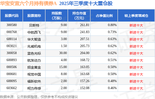 根据2025基金Q3季报公募基金重仓股数据,重仓该股的公募基金共2家,其中持有数量最多的公募基金为华宝基金的华宝安宜六个月持有债券A。华宝安宜六个月持有债券A目前规模为0.71亿元,最新净值1.1371(11月13日),较上一交易日上涨0.04%,近一年上涨6.46%。该公募基金现任基金经理为李栋梁。李栋梁在任的基金产品包括:华宝宝康债券A,管理时间为2011年6月28日至今,期间收益率为86.89%;华宝可转债债券A,管理时间为2016年6月1日至今,期间收益率为94.3%;华宝新飞跃灵活配置混合,管理时间为2017年2月27日至今,期间收益率为137.92%;华宝双债增强债券A,管理时间为2021年4月23日至今,期间收益率为20.62%。