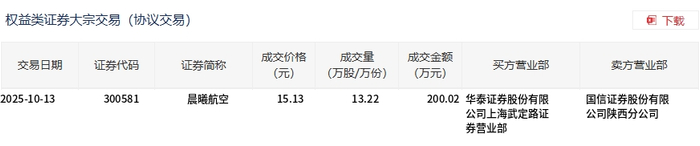 10月13日,晨曦航空大宗交易成交13.22万股,成交额200.02万元,占当日总成交额的0.2%,成交价15.13元,较市场收盘价18.29元折价17.28%。