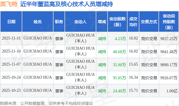 英飞特:11月11日高管GUICHAO HUA减持股份合计4.23万股