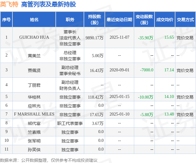 英飞特近半年内的董监高及核心技术人员增减持详情如下: