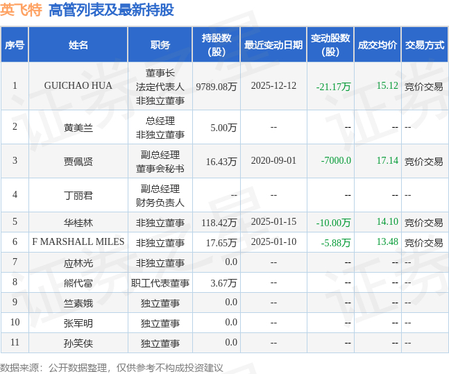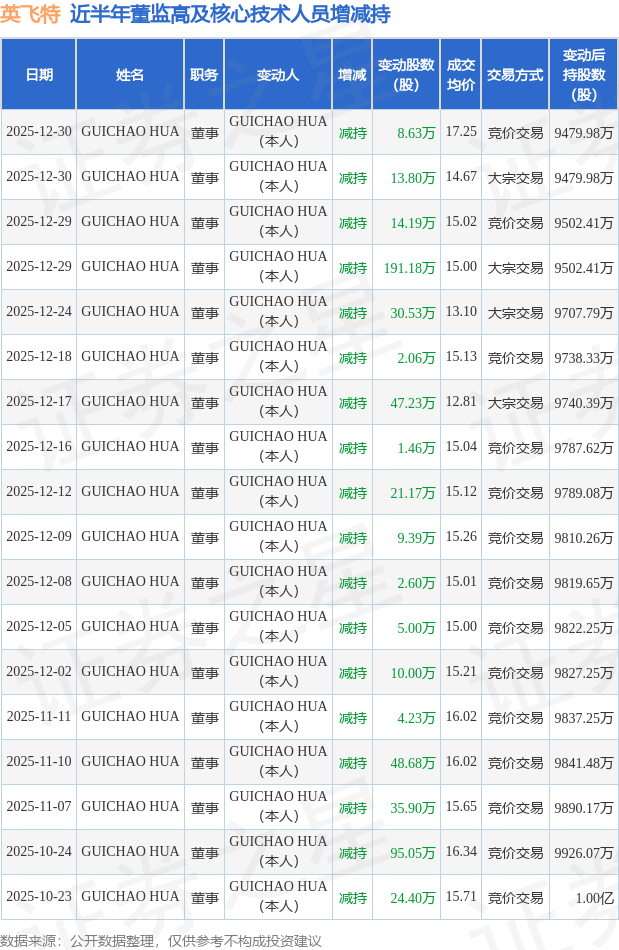 英飞特:12月30日高管GUICHAO HUA减持股份合计22.43万股