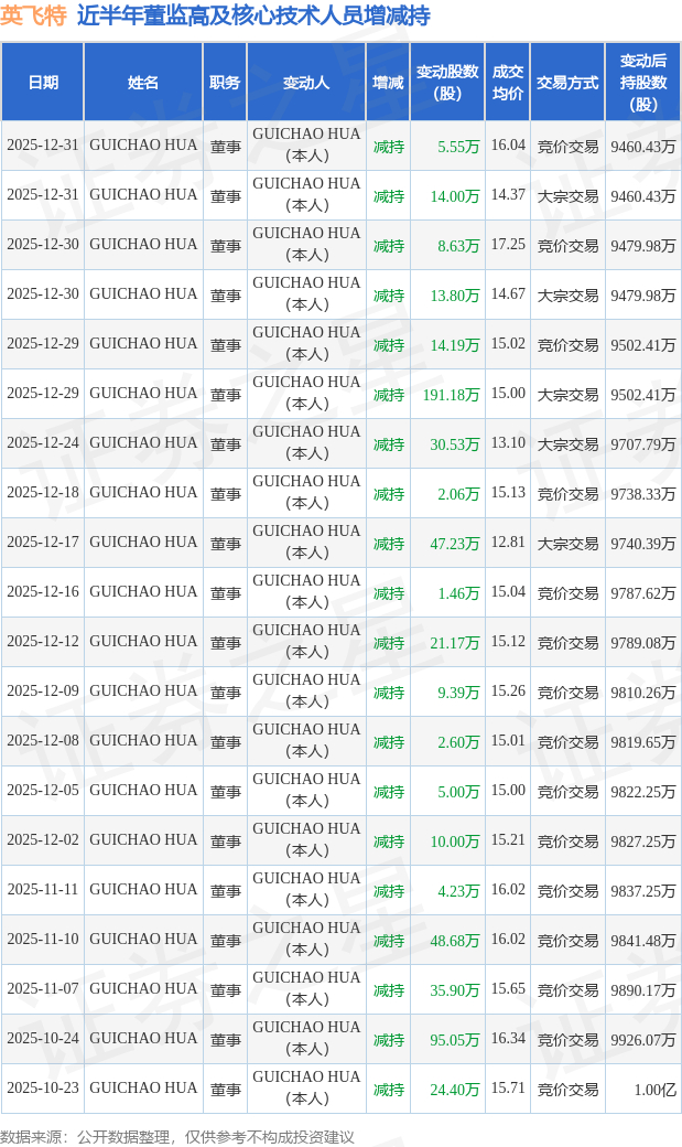 英飞特:12月31日高管GUICHAO HUA减持股份合计19.55万股