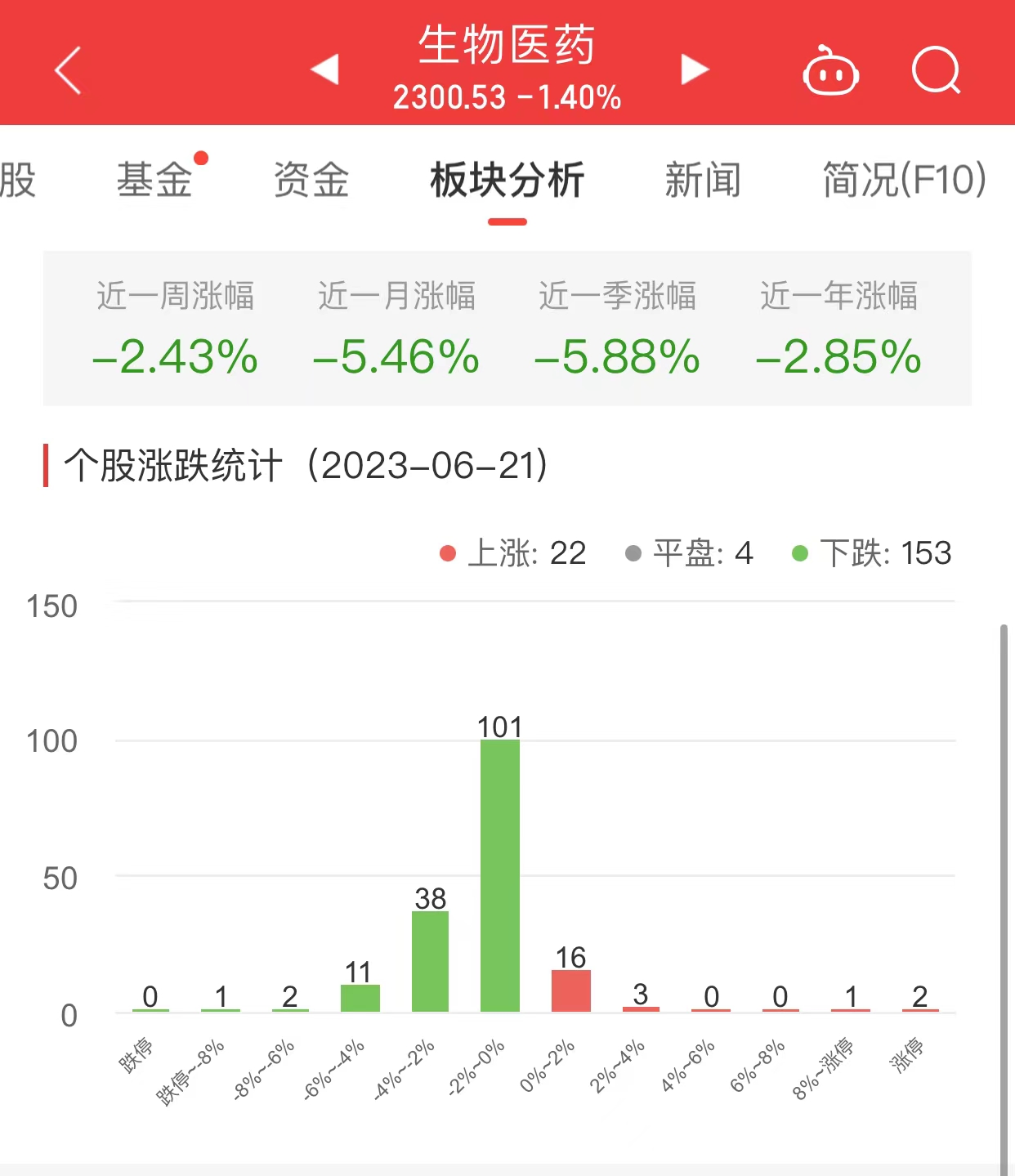 中国经济网北京6月21日讯今日,生物医药板块整体跌幅1.4%,其中22只股票上涨,4只股票平盘,153只股票下跌。