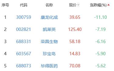 康龙化成、凯莱英、荣昌生物、珍宝岛、毕得医药位列涨幅榜后五位,涨幅分别为-11.10%、-7.19%、-6.16%、-5.90%、-5.62%。
