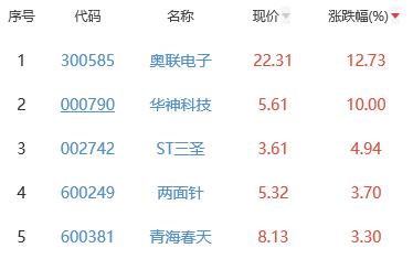 其中,奥联电子、华神科技、ST三圣、两面针、青海春天位列板块涨幅前五位,涨幅分别为12.73%、10.00%、4.94%、3.70%、3.30%。