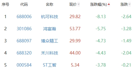 杭可科技、鸿富瀚、博众精工、禾川科技、ST工智位列涨幅榜后五位,涨幅分别为-8.13%、-5.75%、-4.73%、-4.43%、-3.78%。
