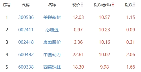 其中,美联新材、必康退、康盛股份、中国动力、西藏珠峰位列板块涨幅前五位,涨幅分别为10.57%、10.23%、10.16%、10.02%、9.98%。