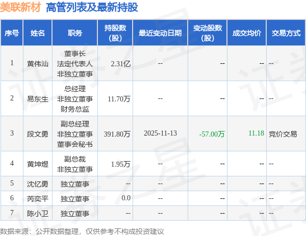美联新材近半年内的董监高及核心技术人员增减持详情如下: