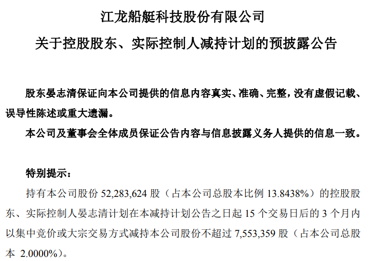 江龙船艇:控股股东拟减持不超2%股份,不超过755.34万股