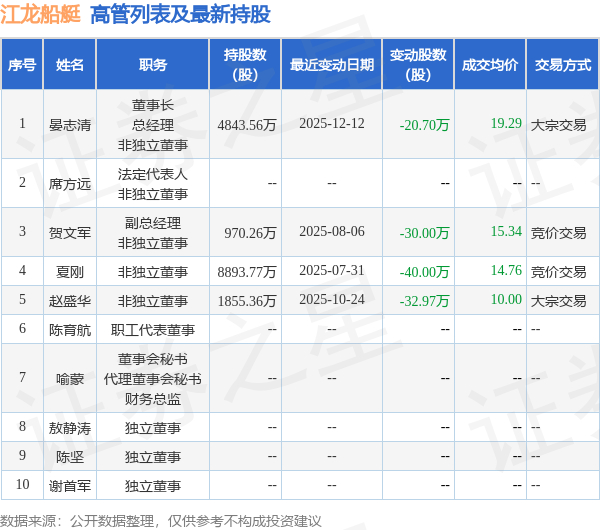 江龙船艇的高管列表及最新持股情况如下: