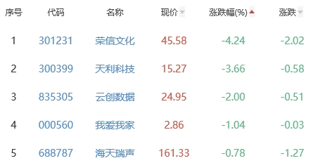 荣信文化、天利科技、云创数据、我爱我家、海天瑞声位列涨幅榜后五位,涨幅分别为-4.24%、-3.66%、-2.00%、-1.04%、-0.78%。