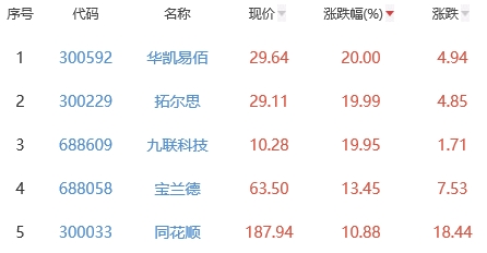 其中,华凯易佰、拓尔思、九联科技、宝兰德、同花顺位列板块涨幅前五位,涨幅分别为20.00%、19.99%、19.95%、13.45%、10.88%。