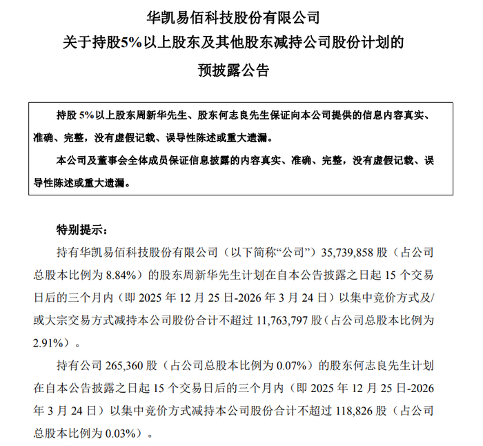 12月3日,华凯易佰(300592.SZ)发布公告,股东周新华先生计划在自本公告披露之日起15个交易日后的三个月内(即2025年12月25日-2026年3月24日)以集中竞价方式及/或大宗交易方式减持公司股份合计不超过1176.38万股(占公司总股本比例为2.91%)。