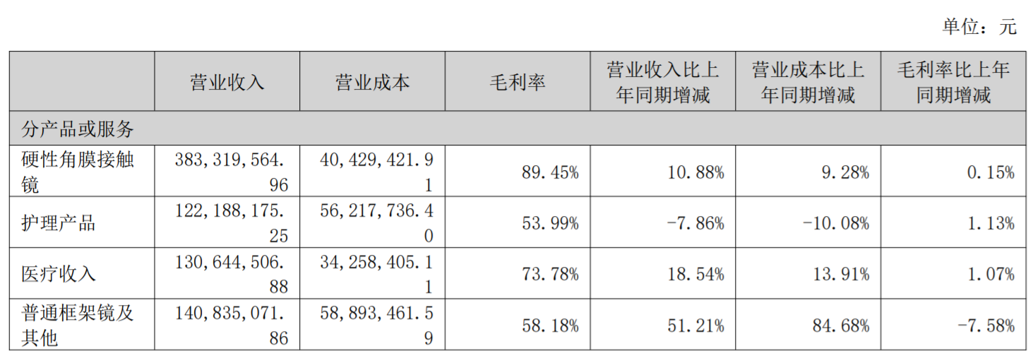 图片来源:半年报截图尽管报告期内,欧普康视的核心业务硬性角膜接触镜仍实现增长,但10.88%的增速相比前几年近40%的增速已放缓不少。