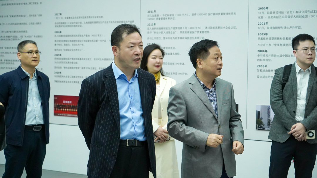 在企业展厅,陶悦群董事长向叶国标一行详细介绍了公司的发展历程、产业布局以及产业生态构建等方面的显著成果。欧普康视自成立以来,始终专注于视光领域,经过多年的深耕细作,已形成了完整的产业生态。从核心产品的研发生产,到上下游产业链的协同发展,欧普康视走出了一条独具特色的发展道路。同时,陶悦群董事长重点介绍了公司在产品研发创新、市场拓展策略以及新业务增长点培育等方面所采取的具体举措。调研组对欧普康视在视光领域的专业专注以及持续创新能力表示赞赏。他们认为,欧普康视在视光领域的技术实力和市场影响力有目共睹,其发展模式和经验值得行业借鉴。