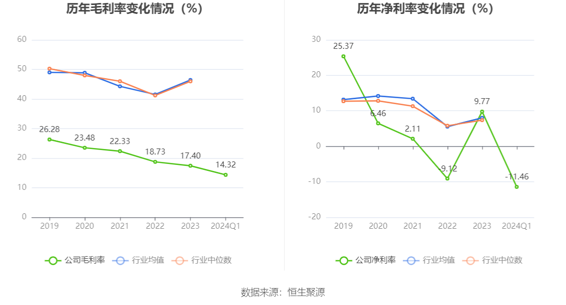 2024年第一季度,公司毛利率为14.32%,同比下降0.26个百分点;净利率为-11.46%,较上年同期上升4.63个百分点。