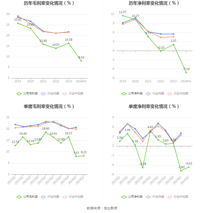2024年上半年,公司毛利率为8.10%,同比下降9.37个百分点;净利率为-7.16%,较上年同期下降10.50个百分点。从单季度指标来看,2024年第二季度公司毛利率为8.21%,同比下降8.20个百分点,环比上升0.24个百分点;净利率为-6.63%,较上年同期下降8.58个百分点,较上一季度上升1.17个百分点。