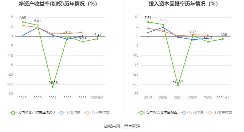 数据显示,2024年上半年公司加权平均净资产收益率为-1.27%,较上年同期增长0.71个百分点;公司2024年上半年投入资本回报率为-1.38%,较上年同期增长0.30个百分点。