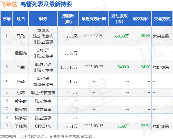 飞荣达的高管列表及最新持股情况如下: