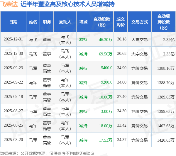 飞荣达近半年内的董监高及核心技术人员增减持详情如下: