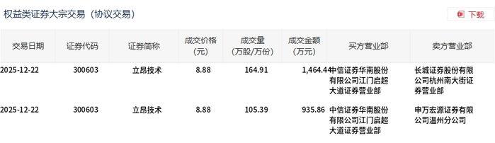 12月22日,立昂技术大宗交易成交270.3万股,成交额2400.3万元,占当日总成交额的35.54%,成交价8.88元,较市场收盘价9.61元折价7.6%。