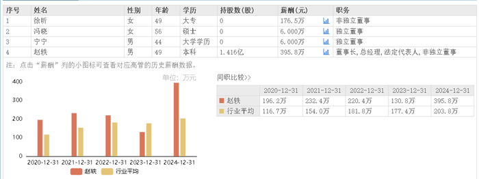据东方财富网数据,长川科技董事长兼总经理赵轶2024年所获薪酬为395.8万元,相较上年薪酬130.8万元涨薪202.60%。长川科技董事徐昕同年领薪176.5万元,二人2024年合计领薪572.3万元。