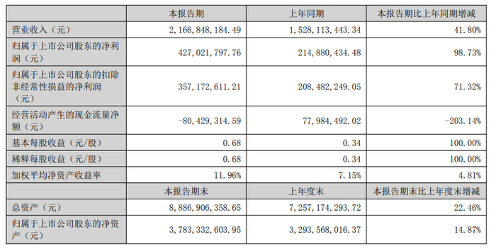 报告显示,长川科技公司上半年营业收入为21.67亿元,同比增长41.80%;归母净利润为4.27亿元,同比增长98.73%;扣非归母净利润为3.57亿元,同比增长71.32%;基本每股收益0.68元。