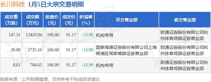 1月5日长川科技现3笔折价13.99%的大宗交易 合计成交1.69亿元