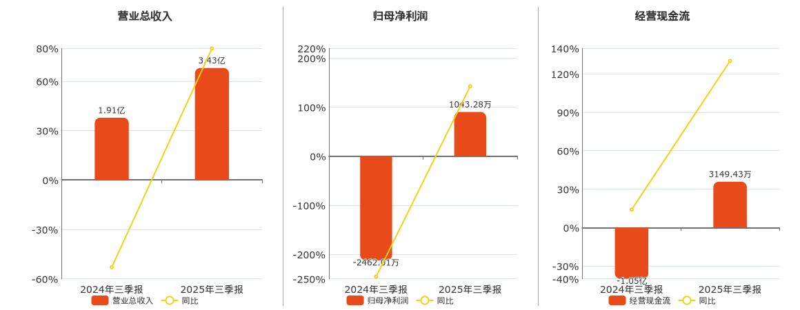 公司营业总收入为3.43亿元,在已披露的同业公司中排名第72。归母净利润为1043.28万元。经营活动现金净流入为3149.43万元。