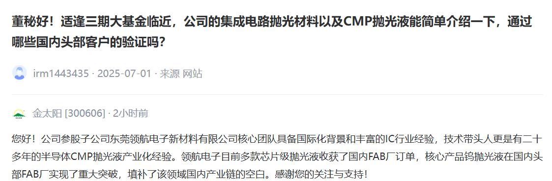 金太阳:参股子公司的多款芯片级抛光液收获了国内FAB厂订单