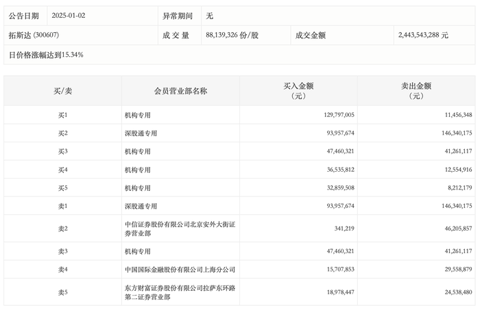 龙虎榜丨拓斯达今日涨15.34%,四机构净买入1.73亿元