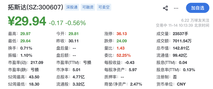 截至发稿时,拓斯达A股报29.94亿元,总市值约142.81亿元。