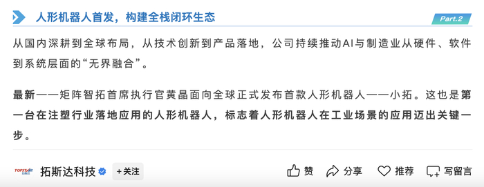 值得一提的是,今年9月12日,拓斯达正式对外发布首款人形机器人新品“小拓”,率先应用在注塑领域,正式进军人形机器人赛道。