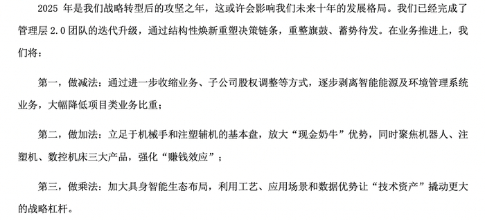 按照其说法,2025年是公司战略转型后的攻坚之年,这或许会影响我们未来十年的发展格局。做减法,即通过进一步收缩业务、子公司股权调整等方式,逐步剥离智能能源及环境管理系统业务,大幅降低项目类业务比重;做加法,即立足于机械手和注塑辅机的基本盘,放大“现金奶牛”优势,同时聚焦机器人、注塑机、数控机床三大产品,强化“赚钱效应”;做乘法,即加大具身智能生态布局,利用工艺、应用场景和数据优势让“技术资产”撬动更大的战略杠杆。