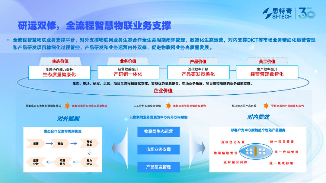 思特奇运营商物联支撑平台以“设备-数据-AI-应用-安全”为核心脉络,精准聚焦运营商及中大型物联网企业需求,对外实现物联网业务生态合作全生命周期闭环管理,以数智化手段赋能生态高效运营;对内支撑DICT等市场业务精细化运营与产品研发项目全流程管控,通过“产品研发与业务运营”内外双修,助力企业实现“生态质量健康化、产研销一体化、经营管理数智化”的核心价值,全面驱动物联网业务高质量发展。