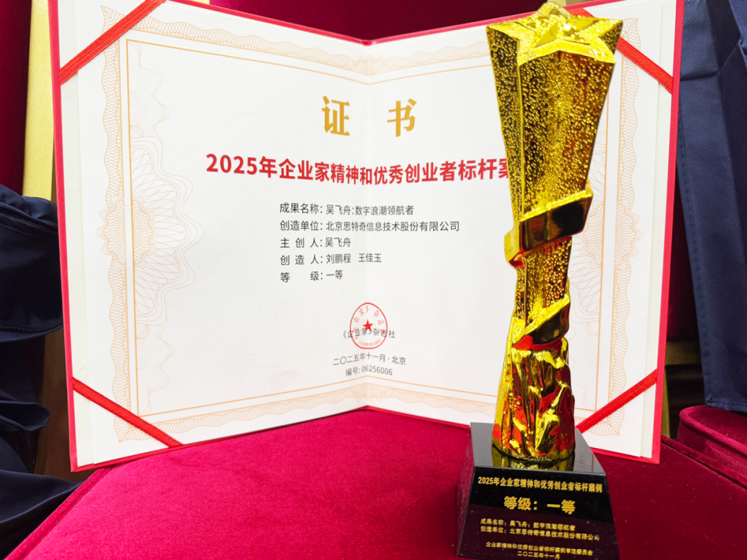 北京思特奇信息技术股份有限公司受邀参加本次大会,公司申报的《吴飞舟:数字浪潮领航者》课题,荣获“2025年企业家精神和优秀创业者标杆案例”一等荣誉。该奖项不仅是对思特奇三十年来在吴飞舟董事长带领下发展成就的肯定,更是对思特奇坚持为客户创造价值、践行高质量发展的高度认可。