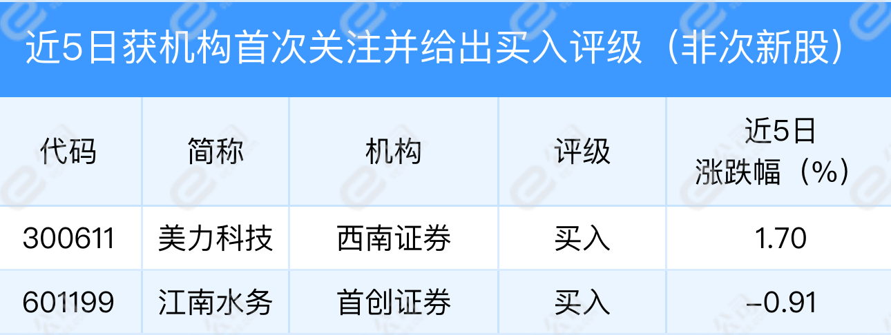 美力科技、江南水务等在5日内获得机构首次关注并给出买入评级。