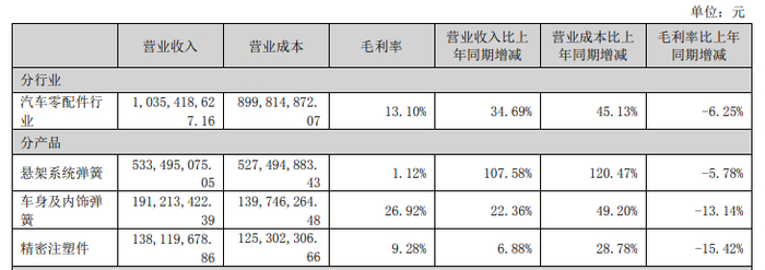 新能源车悬架弹簧因轻量化趋势,需要使用高强度材料,同时设计复杂度的提升也带来了更高的技术附加值。这一战略转型的效果显著,新能源悬架弹簧的收入从2022年的5.33亿元增长至2024年的8.57亿元,两年内增幅达60.8%。