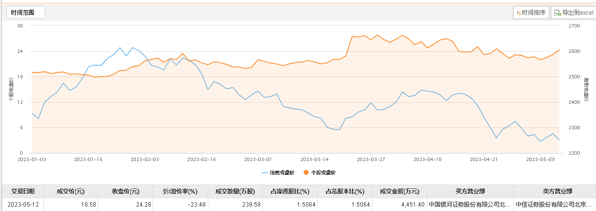 大宗交易成交239.58万股,成交额4451.4万元,占当日总成交额的5.75%,成交价18.58元,较市场收盘价24.28元折价23.48%。