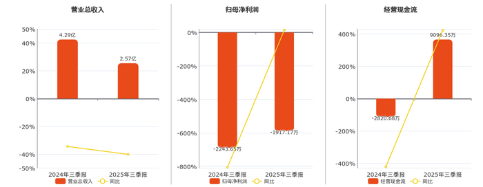 公司营业总收入为2.57亿元,较去年同报告期营业总收入减少1.72亿元,同比较去年同期下降40.10%。归母净利润为-1917.17万元。经营活动现金净流入为9096.35万元。
