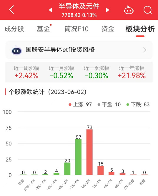 中国经济网北京6月2日讯 今日,半导体及元件板块整体涨幅0.13%,其中,97只股票上涨,10只股票平盘,83只股票下跌。