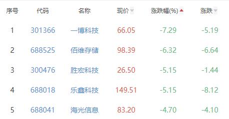 一博科技、佰维存储、胜宏科技、乐鑫科技、海光信息位列涨幅榜后五位,涨幅分别为-7.29%、-6.32%、-5.15%、-5.15%、-4.70%。