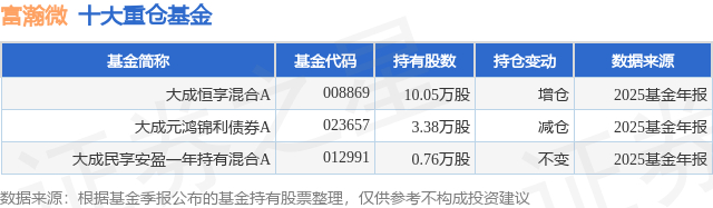 根据2025基金年报公募基金重仓股数据,重仓该股的公募基金共3家,其中持有数量最多的公募基金为大成基金的大成恒享混合A。大成恒享混合A目前规模为0.42亿元,最新净值1.2802(3月13日),较上一交易日下跌0.81%,近一年上涨9.54%。该公募基金现任基金经理为李煜。李煜在任的基金产品包括:大成红利优选一年持有混合发起A,管理时间为2022年11月24日至今,期间收益率为44.42%;大成景禄灵活配置混合A,管理时间为2023年3月30日至今,期间收益率为50.87%;大成优质精选混合A,管理时间为2024年12月27日至今,期间收益率为31.74%。