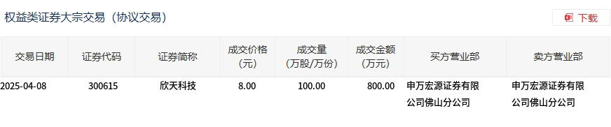 欣天科技今日大宗交易折价成交100万股,成交额800万元