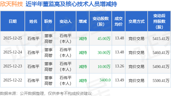 证券之星消息,根据12月26日市场公开信息、上市公司公告及交易所披露数据整理,欣天科技(300615)最新董监高及相关人员股份变动情况:2025年12月25日公司董事,高管石伟平共减持公司股份45.0万股,占公司总股本为0.2329%。变动期间公司股价上涨0.45%,12月25日当日收盘报13.51元。