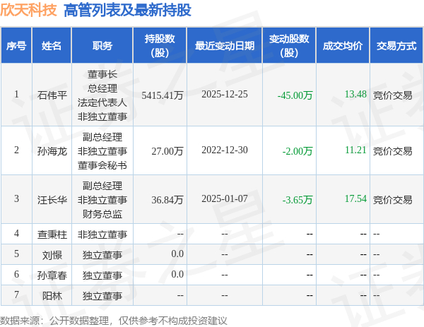 欣天科技的高管列表及最新持股情况如下: