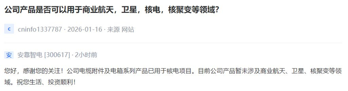 来源:深交所互动易【V观财报丨安靠智电:公司产品暂未涉及商业航天、卫星、核聚变等领域】安靠智电1月22日在投资者互动平台回复提问表示,公司电缆附件及电箱系列产品已用于核电项目。目前公司产品暂未涉及商业航天、卫星、核聚变等领域。(中新经纬APP)